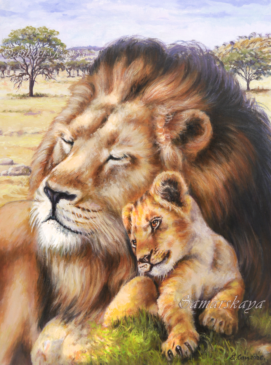 Написана по заказу. По желанию заказчика в львином образе исполнила родную пару навеки вечные самых близких друг другу это ПАПА и Дочка!